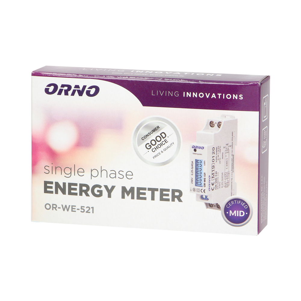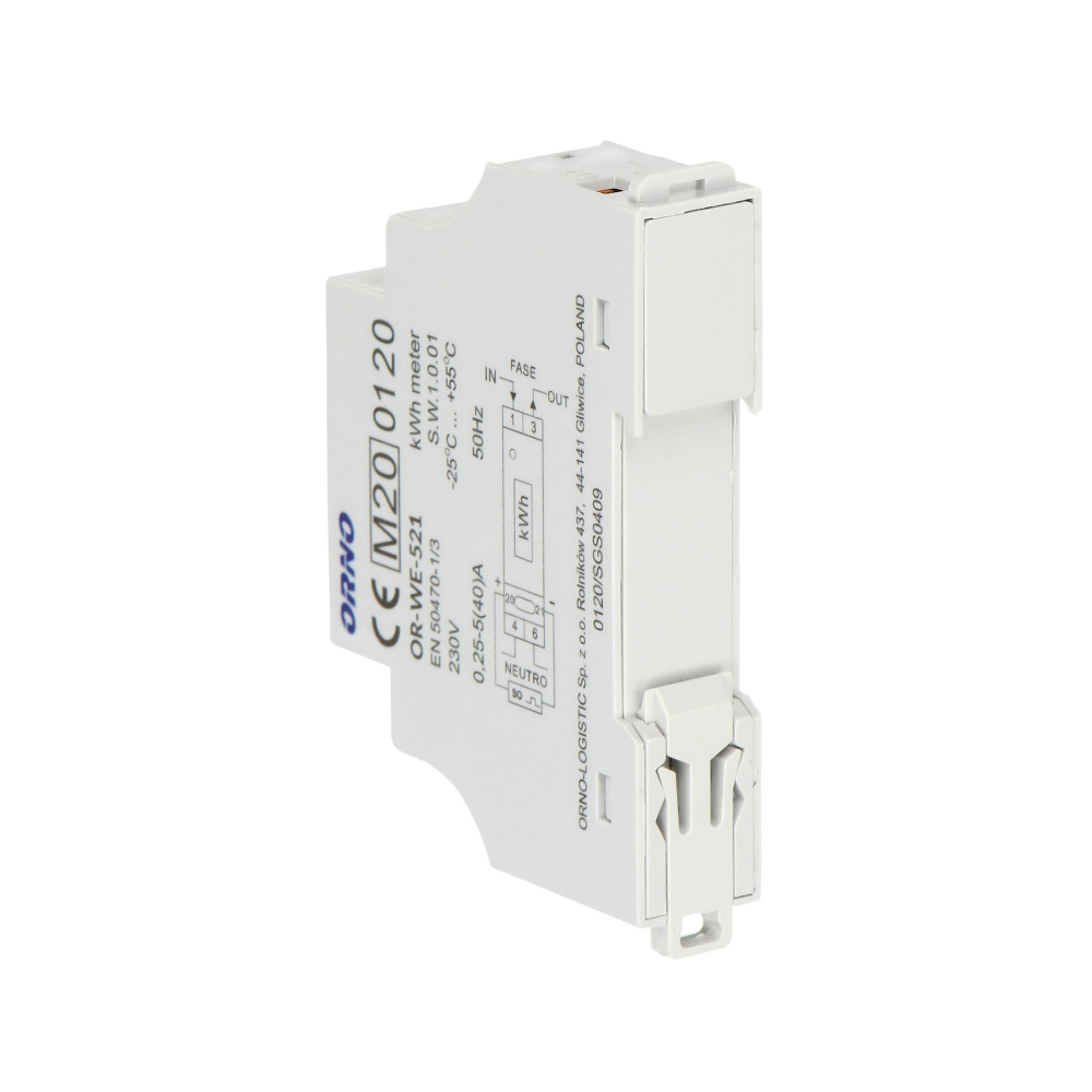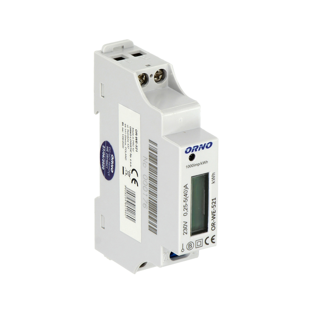 1-fazowy licznik energii elektrycznej, 40A, MID, wyjście impulsowe, podświetlenie, 1 moduł, DIN TH-35mm - OR-WE-521 - ORNO